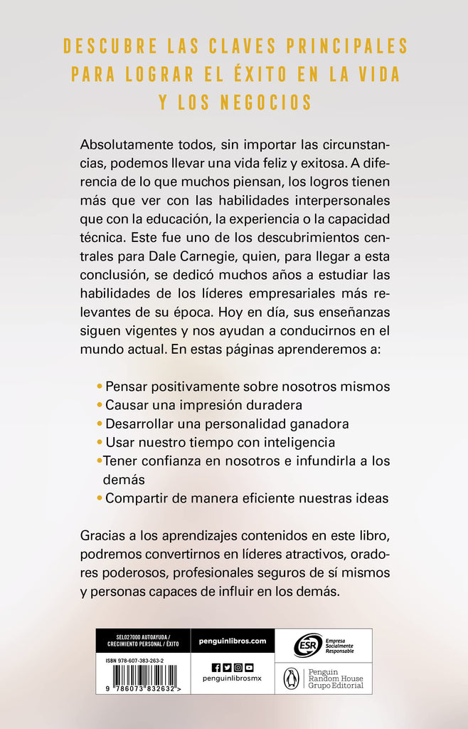 Absolutamente todos, sin importar las circunstacias, podemos llevar una vida feliz y exitosa. A diferencia de lo que muchos piensan, los logros tienen más que ver con las habilidades interpersonales que con la educación, la experiencia o la capacidad técnica. Este fue uno de los descubrimientos centrales para Dale Carnegie, quien, para llegar a esta conclusión, se dedicó muchos años a estudiar las habilidades de los líderes empresariales más relevantes de su época.