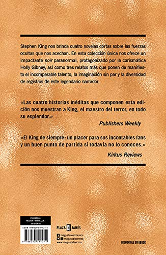 Stephen King presenta una colección de historias que van desde lo inquietante hasta lo profundamente emotivo. Incluye el regreso de la detective Holly Gibney en su primer caso en solitario, una amistad que trasciende la muerte, una reflexión sobre la existencia y el oscuro pacto de un escritor desesperado.